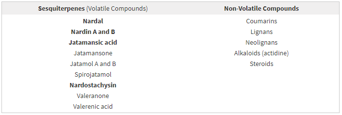 The compounds which seem to shine through are jatamansic acid, nardostachysin, nardal, and nardin.